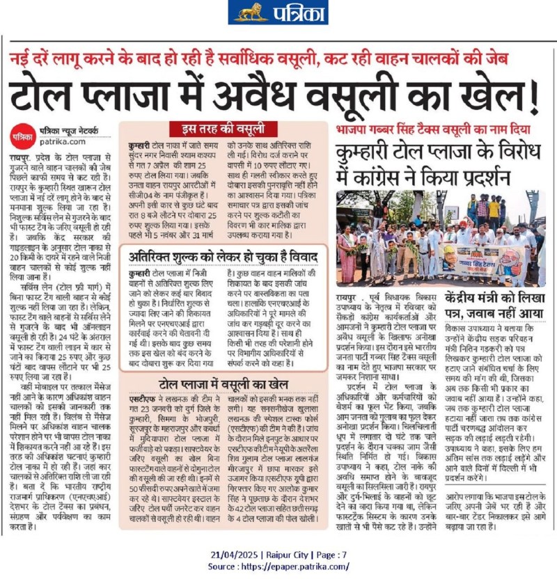 कुम्हारी टोल नाका में जाते समय सुंदर नगर निवासी श्याम कश्यप से गत 7 अप्रैल की शाम 25 रुपए टोल लिया गया। जबकि उनता वाहन रायपुर आरटीओं में सीजी04 के नाम पंजीकृत है। अपनी इसी कार से कुछ घंटे बाद रात 8 बजे लौटने पर दोबारा 25 रुपए शुल्क लिया गया। इसके पहले भी 5 नवंबर और 31 मार्च को उनके साथ अतिरिक्त राशि ली गई। विरोध दर्ज कराने पर वापसी में 10 रुपए लौटाए गए। साथ ही गलती स्वीकार करते हुए दोबारा इसकी पुनरावृत्ति नहीं होने का आश्वासन दिया गया। पत्रिका समाचार पत्र द्वारा इसकी जांच करने पर शुल्क कटौती का विवरण भी कार मालिक द्वारा उपलब्ध कराया गया है।