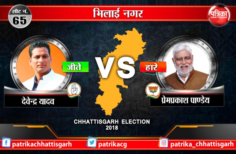 रायपुर. छत्तीसगढ़ की चुनिंदा हाईप्रोफाइल सीटों में से एक भिलाईनगर से भाजपा के उम्मीदवार और रमन सरकार में सीनियर मंत्री प्रेमप्रकाश पाण्डेय चुनाव हार गए हैं। कांग्रेस के युवा चेहरा और भिलाई नगर निगम के महापौर देवेन्द्र यादव ने प्रेमप्रकाश पाण्डेय को करारी शिकस्त दी है। कांग्रेस के देवेन्द्र यादव ने कुल 50342 वोट हासिल कर प्रेमप्रकाश पाण्डेय को 2797 वोटों के अंतर से हरा दिया। प्रेमप्रकाश पाण्डेय को कुल 47545 वोट मिले।