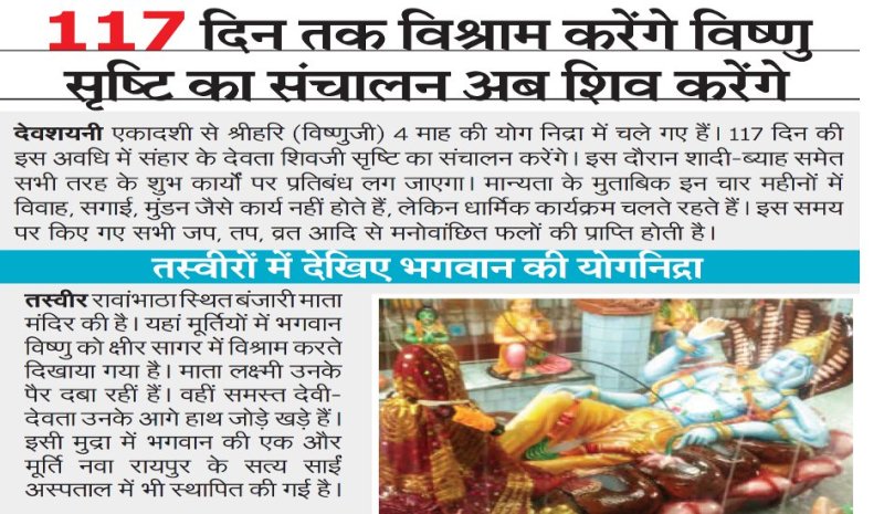 गौरव शर्मा @ रायपुर. श्रीहरि 4 महीने की योग निद्रा में चले गए हैं। इस बीच शादी-ब्याह प्रतिबंधित रहेंगे। रिश्तों की तलाश जरूर तेज हो जाएगी। ग्रह-नक्षत्रों की बाधा कई बार बाधा बन जाती है। यानी रिश्ता इसलिए तय नहीं हो पाता, क्योंकि कुंडली में मंगल या नाड़ी का दोष है। लड़का-लड़की की योग्यता का महत्व नहीं रह जाता। 'पत्रिकाÓ ने जब इस विषय पर सामाजिक प्रतिनिधियों से चर्चा की तो उन्होंने माना, यह बड़ी समस्या है। सभी ने एकमत होकर कहा कि केवल ग्रहों की दशा किसी का भविष्य तय नहीं करती। व्यक्ति के अपने गुण-दोष इसके लिए जिम्मेदार होते हैं। इसी से उनके जीवन की दिशा तय होती है। प्रतिनिधियों ने अपील करते हुए यह भी कहा कि व्यवहारिक ²ष्टिकोण अपनाते हुए योग्यता पर ध्यान दें। बेहतर जीवनसाथी का चुनाव इससे आसान होगा और क्या कहा सामाजिक प्रतिनिधियों ने। आइए जानते हैं...