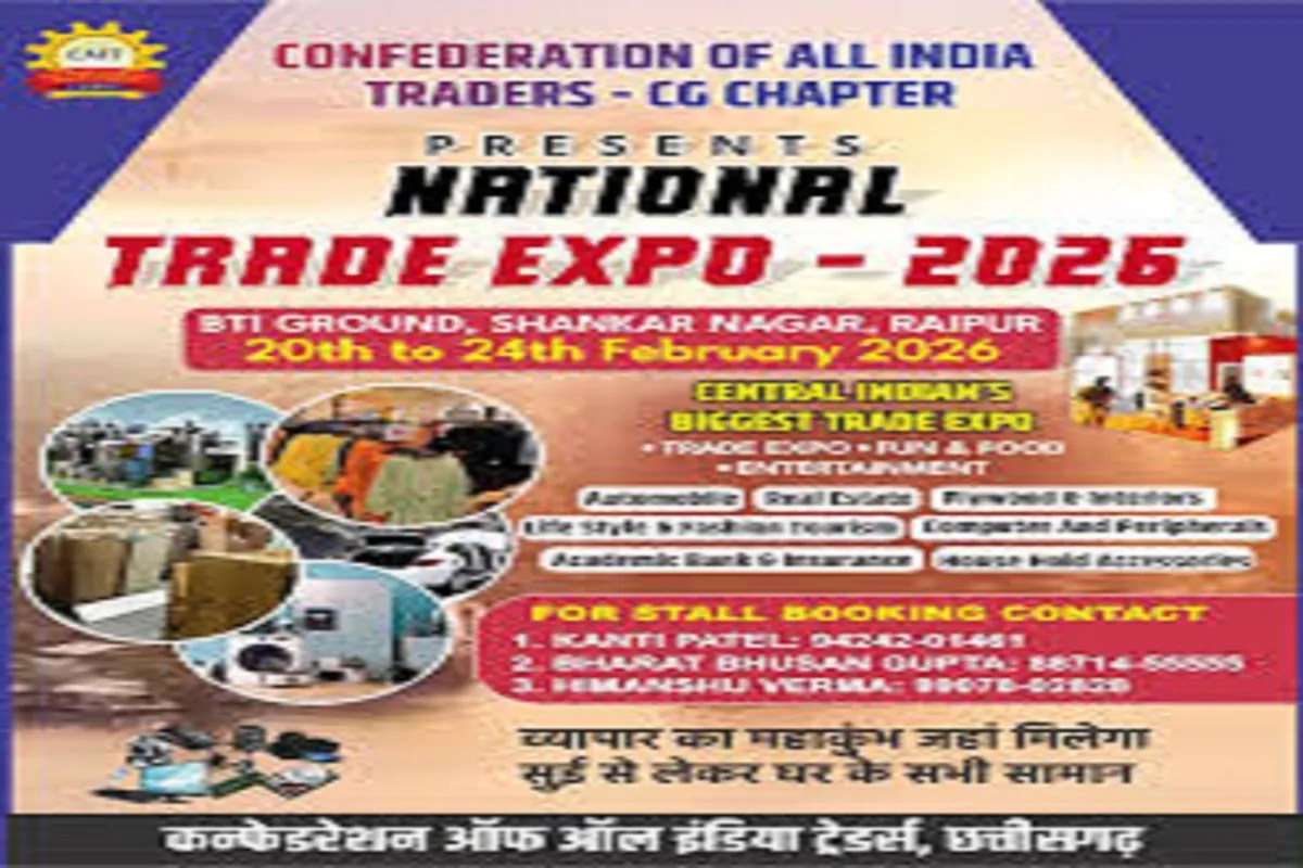 National Trade Expo: कन्फेडरेशन ऑफ ऑल इंडिया ट्रेडर्स (कैट) के तत्वावधान में 20 से 24 फरवरी तक रायपुर में नेशनल ट्रेड एक्सपो 2026 का आयोजन किया जाएगा। कैट के राष्ट्रीय वाइस चेयरमेन अमर पारवानी ने बताया कि एक्सपो बीटीआई ग्राउंड, शंकर नगर में होगा। इसमें लगभग 250 से अधिक प्रतिष्ठित ब्रांड भाग लेंगे।