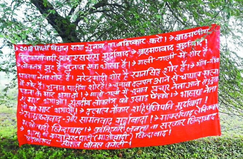 'पत्रिका' ने पहले ही खुलासा किया था कि नक्सली इन दिनों चुनाव का बहिष्कार करने के लिए गांव-गांव में बैठक ले रहे हैं। नक्सलियों ने अपने बैनर पोस्टर में प्रधानमंत्री और मुख्यमंत्री समेत अन्य भाजपा नेताओं के खिलाफ आपत्तिजनक शब्दो का प्रयोग किया है। नक्सलियों द्वारा मुख्य मार्ग पर बैनर लगाए जाने की जानकारी मिलने के बाद मौके पर पहुचे भोपालपटनम के एसडीओपी और पुलिस की टीम ने बैनर जब्त कर लिया।