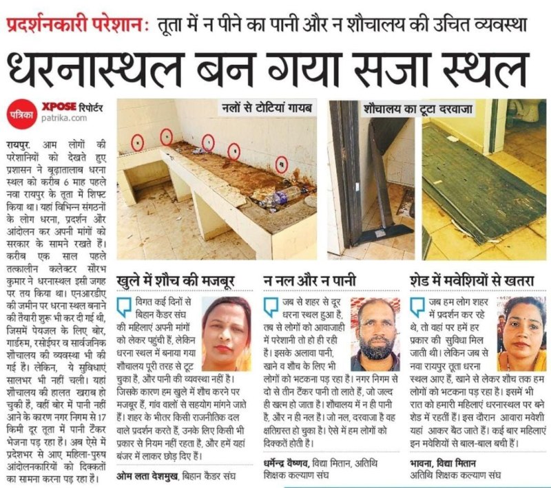 विद्या मितान, अतिथि शिक्षक कल्याण संघ के भावना ने बताया कि जब हम लोग शहर में प्रदर्शन कर रहे थे, तो वहां पर हमें हर प्रकार की सुविधा मिल जाती थी। लेकिन जब से नवा रायपुर तूता धरना स्थल आए हैं, खाने से लेकर शौच तक हम लोगों को भटकना पड़ रहा है। इसमें भी रात को हमारी महिलाएं धरनास्थल पर बने शेड में रहतीं हैं। इस दौरान आवारा मवेशी यहां आकर बैठ जाते हैं। कई बार महिलाएं इन मवेशियों से बाल-बाल बची हैं।