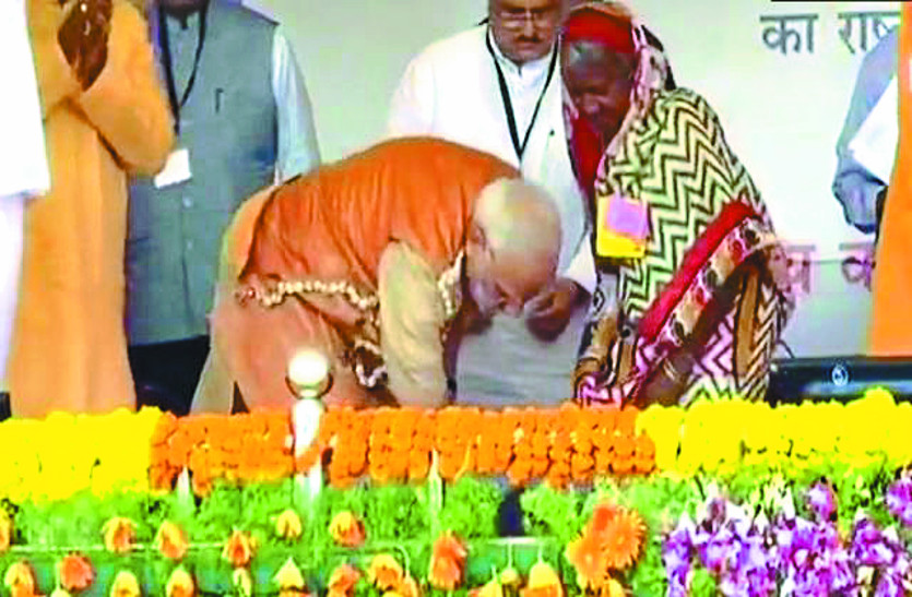 प्रधानमंत्री नरेंद्र मोदी ने स्थानीय आदिवासी महिला रतनी बाई को अपने हाथों से चरणपादुका पहनाईं। चरणपादुका योजना के तहत तेंदूपत्ता बीनने वाली आदिवासी महिलाओं को चरणपादुकाएं दी जाती हैं, जिससे वह जंगलों में आसानी से चल सकें।