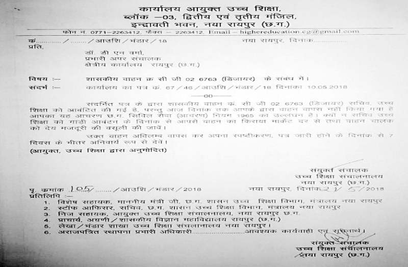 उच्च शिक्षा संचालनालय के पत्र से हुआ खुलासा इस पूरे मामले का खुलासा 21 मई 2018 को कार्यालय उच्च शिक्षा संचालनालय द्वारा क्षेत्रीय प्रभारी अपर संचालक को लिखे गए पत्र से हुआ, जिसकी प्रति पत्रिका के पास मौजूद है। इसमें साफ तौर पर उल्लेखित किया गया है, कि वाहन क्रमांक- सीजी-02-6763, डिजायर को उच्च शिक्षा सचिव को आबंटित की गई है। जबकि इस वाहन सहित प्रदत्त चालक का उपभोग अब भी उनके माध्यम से किया जा रहा है, छग सिविल सेवा आचरण नियम 1965 का सीधा उल्लंघन है।