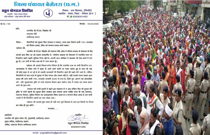 छत्तीसगढ़ में 74993 मितानिन रात और दिन लोगों की सुरक्षा में लगीं हुई है ताकि ग्रामीण क्षेत्रों में कोरोना संक्रमण को रोका जा सकें। इनकी सुरक्षा, सम्मान व व्यथा को लेकर आज अंकुर समाज सेवी संस्था के प्रदेश संयोजक एवं जिला पंचायत बेमेतरा के सभापति राहुल योगराज टिकरिहा ने मुख्यमंत्री भूपेश बघेल और स्वास्थ्य मंत्री टी.एस. सिंहदेव को पत्र लिखकर मितानिनों को सुरक्षा किट (मास्क व ग्लब्स), राज्य द्वारा मिलने वाली 75% राज्यांश को निरंतर प्रदाय करने व बीमा एवं सम्मान प्रदान करने का निवेदन किया है।
