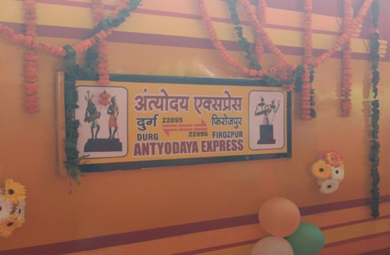 रायपुर . रायपुर रेलवे स्टेशन से दुर्ग-फि रोजपुर-दुर्ग नई यात्री गाड़ी अन्त्योदय एक्सप्रेस ट्रेन का केन्द्रीय रेल राज्य मंत्री राजेन गोहांई और मुख्यमंत्री रमन सिंह ने आज हरी झंडी दिखाकर शुभारंभ किया। सांसद रमेश बैस, सांसद छाया वर्मा, विधायक श्रीचंद सुंदरानी और महापौर प्रमोद दुबे मौजूद थे। इस ट्रेन की सबसे खास बात यह है कि अब दिल्ली जाने वाले यात्री बिना रिजर्वेशन कर सफर कर सकेंगे।