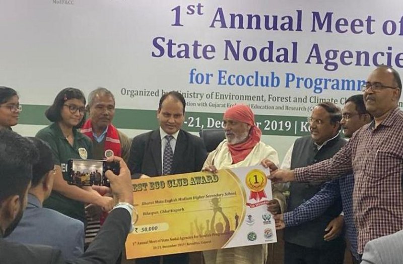रायपुर. छत्तीसगढ़ के भारत माता इग्लिश मीडियम स्कूल बिलासपुर के ईको-क्लब को उत्कृष्ट कार्य के लिये राष्ट्रीय स्तर पर सर्वश्रेष्ठ ईको-क्लब का पुरस्कार प्राप्त हुआ है। गुजरात के केवडिया में विगत 20 एवं 21 दिसम्बर को आयोजित प्रथम राष्ट्रीय सम्मेलन में केन्द्रीय अतिरिक्त सचिव पर्यावरण, वन एवं जलवायु परिवर्तन अरविंद नौटियाल द्वारा इन्हें पचास हजार की नगद राशि एवं प्रशस्ति पत्र से सम्मानित किया गया। इस अवसर पर पर्यावरण के क्षेत्र में उल्लेखनीय कार्य कर रहे पद्मश्री डॉ अनिल प्रकाश जोशी एवं जाधव पयांग भी उपस्थित थे।
