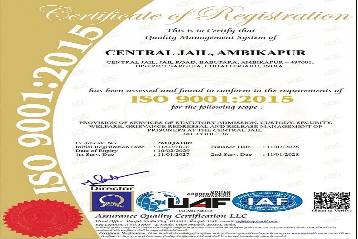 Raipur News: रायपुर छत्तीसगढ़ के रायपुर सहित दुर्ग, बिलासपुर और अंबिकापुर सेंट्रल जेल को अंतरराष्ट्रीय गुणवत्ता मानक आईएसओ 9001ः2015 का प्रमाणन सम्मान दिया गया है।