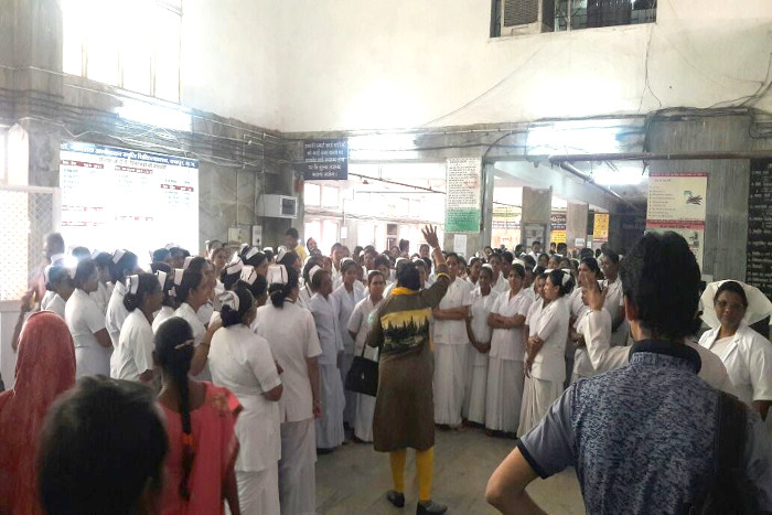 नर्सों ने स्टाफ बढ़ाने और वेतन वृद्धि की मांग को लेकर काम बंद कर अस्पताल में नारेबाजी कर रहे हैं। प्रदर्शनकारी सीएमओ कार्यालय के सामने धरने पर बैठकर प्रदर्शन कर रहे हैं। प्रदर्शन को देखते हुए अस्पलात में पुलिस जवान भी तैनात किए गए हैं। प्रदर्शनकारियों का कहना है कि स्टाफ बढ़ाने और वेतन वृद्धि को लेकर अस्पताल प्रशासन को कई बार आवेदन दिया जा चुका बावजूद इस पर कोई सुनवाई नहीं की गई है। वहीं, आज मांगों को लेकर हड़ताल करने की ठानी। उनका है कि अस्पताल प्रशासन जब तक उनकी मांगों को नहीं सुनती तब तक हड़ताल करते रहेंगे।
