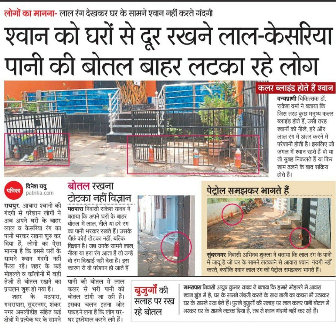 गभरापारा निवासी आयुष कुमार यादव ने बताया कि हमारे मोहल्ले में आवारा श्वान झुंड में है, घर के सामने गंदगी करने के साथ नाली का कचरा भी उठाकर घर के सामने रख देते हैं। पुराने बुजुर्गों की सलाह पर लाल कलर पानी बोटल में भरकर घर के सामने लटका दिया है, तब से श्वान गंदगी नहीं कर रहे हैं।