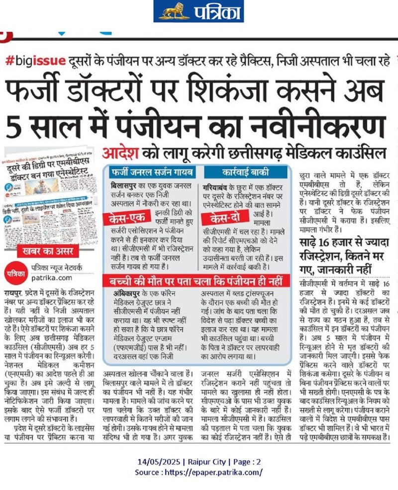 प्रदेश में दूसरे डॉक्टरों के लाइसेंस या पंजीयन पर प्रैक्टिस करना या अस्पताल खोलना चौंकाने वाला है। बिलासपुर वाले मामले में तो डॉक्टर का पंजीयन भी नहीं है। यह गंभीर मामला है। मामले की जांच करने पर पता चलेगा कि उक्त डॉक्टर की लापरवाही से कितने मरीजों की जान गई होगी। उसके गायब होने से मामला संदिग्ध भी हो गया है। अगर युवक जनरल सर्जरी एसोसिएशन में रजिस्ट्रेशन कराने नहीं पहुंचता तो मामले का खुलासा ही नहीं होता। सीएमएचओ के पास भी उक्त युवक के बारे में कोई जानकारी नहीं है। मामला सीजीएमसी में है। काउंसिल की पड़ताल में पता चला कि युवक का कोई रजिस्ट्रेशन नहीं है। ऐसे ही छुरा वाले मामले में एक डॉक्टर एमबीबीएस तो है, लेकिन एनेस्थेटिस्ट की डिग्री दूसरे डॉक्टर की है। यानी दूसरे डॉक्टर के रजिस्ट्रेशन पर डॉक्टर ने फेक पंजीयन सीजीएमसी में कराया है। इसलिए मामला गंभीर है।