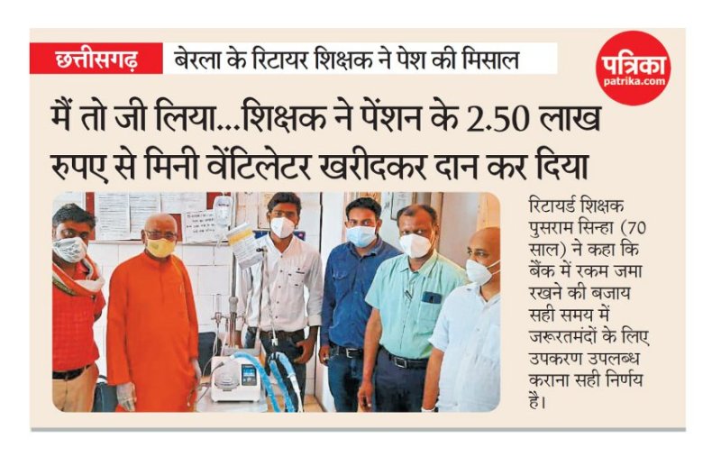 रायपुर । छत्तीसगढ़ के एक रिटायर्ड शिक्षक ने मनवता की मिसाल पेश की है। सेवानिवृत्त शिक्षक ने समाज के लिए अपनी पेंशन की राशि खर्च कर दी। रिटायर्ड शिक्षक पुसराम सिन्हा करीब 70 साल के हैं। उन्होंने अपने पेंशन की राशि ढाई लाख रुपए से एक मिनी वेंटिलेटर मशीन खरीद कर अपने माता पिता की स्मृति में बेरला के शासकीय अस्पताल को सौंपा। वयोवृद्ध सेवानिवृत्त शिक्षक बेमेतरा जिले के बेरला नगर के है।