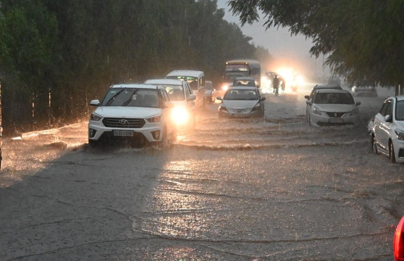 जोरदार बारिश में तेलीबांधा की सड़क बनी तालाब
