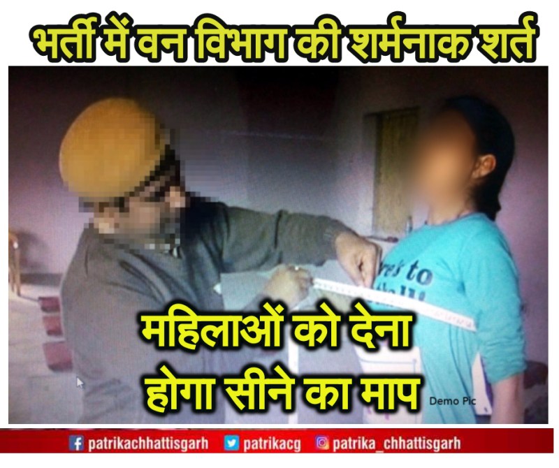 रायपुर . वन विभाग में सहायक वन संरक्षक और वन क्षेपत्रपाल की भर्ती में महिलाओं की नापजोख पर बवाल खड़ा हो गया है। छत्तीसगढ़ लोक सेवा आयोग ने इसके लिए हाल ही में विज्ञापन जारी किया है। विज्ञापन में महिलाओं के लिए भी सीने की माप और पांच सेंटीमीटर तक सीना फुलाने का प्रावधान अनिवार्य किया गया है।इसपर ध्यान जाने के बाद राज्य महिला आयोग ने वन विभाग के सचिव को नोटिस जारी कर सात दिन के भीतर जवाब मांगा है। राज्य महिला आयोग की अध्यक्ष हर्षिता पाण्डेय ने बताया कि वन विभाग से पूछा गया है कि किस आधार पर इस नियम को लागू किया गया है।