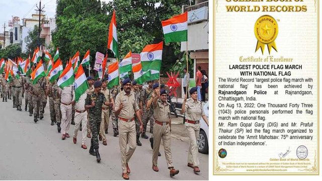इस तिरंगा यात्रा में अतिरिक्त पुलिस अधीक्षक डोंगरगढ़ नेहा पाण्डेय, अतिरिक्त पुलिस अधीक्षक ऑप्स आकाश मरकाम, न.पु.अ./डी.एस.पी. नेहा वर्मा जिला बल, आईटीबीपी, सीएएफ और पीटीएस राजनांदगांव के जवान तथा एन.सी.सी. केडेट्स और स्काउट के 1043 वर्दीधारियों ने भाग लिया. जिसे गोल्डन बुक ऑफ वर्ल्ड रिकार्ड में दर्ज किया गया है. मिली जानकारी के अनुसार अमृत महोत्सव के अवसर पर उप पुलिस महानिरीक्षक राजनांदगांव रेंज रामगोपाल गर्ग और पुलिस अधीक्षक प्रफुल्ल ठाकुर के नेतृत्व में राजनांदगांव में तिरंगा निकाली गई.
