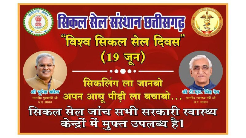 छत्तीसगढ़ की करीब 1 प्रतिशत आबादी रक्त से संबंधित अनुवांशिक रोग सिकलसेल से पीड़ित है। प्रदेश के सभी सामुदायिक स्वास्थ्य केंद्रों, जिला अस्पतालों और मेडिकल कॉलेज अस्पतालों में इसकी नि:शुल्क जांच, दवाइयों एवं परामर्श की सुविधा है। सिकलसेल के मरीजों को जरुरत पड़ने पर लाइसेंसीकृत ब्लड-बैकों से नि:शुल्क ब्लड भी उपलब्ध कराया जाता है। स्वास्थ्य विभाग ने 19 जून को विश्व सिकलसेल दिवस के मौके पर सभी गर्भवती महिलाओं और बच्चों की सिकलसेल जांच कराने की अपील की है। समय पर इसकी पहचान हो जाने से गर्भवती महिलाओं और बच्चों की जान बचाई जा सकती है।