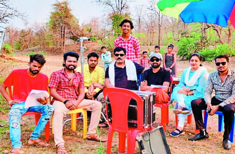 दल्लीराजहरा के बरसाटोला में शूटिंग के दौरान दूसरे क्रम पर अमलेश नागेश, गमछे में अभिनेता पूरण किरी और टोपी पहने निर्देशक मनीष मानिकपुरी।