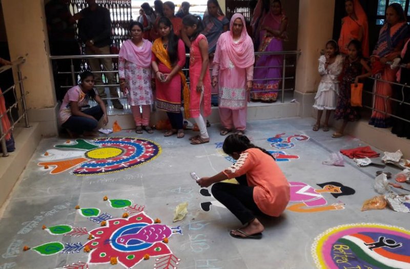 जिसमें रंगोली प्रतियोगिता में चित्र बनाए। रंगोली से मतदान के लिए प्रेरित करने का प्रयास किया।