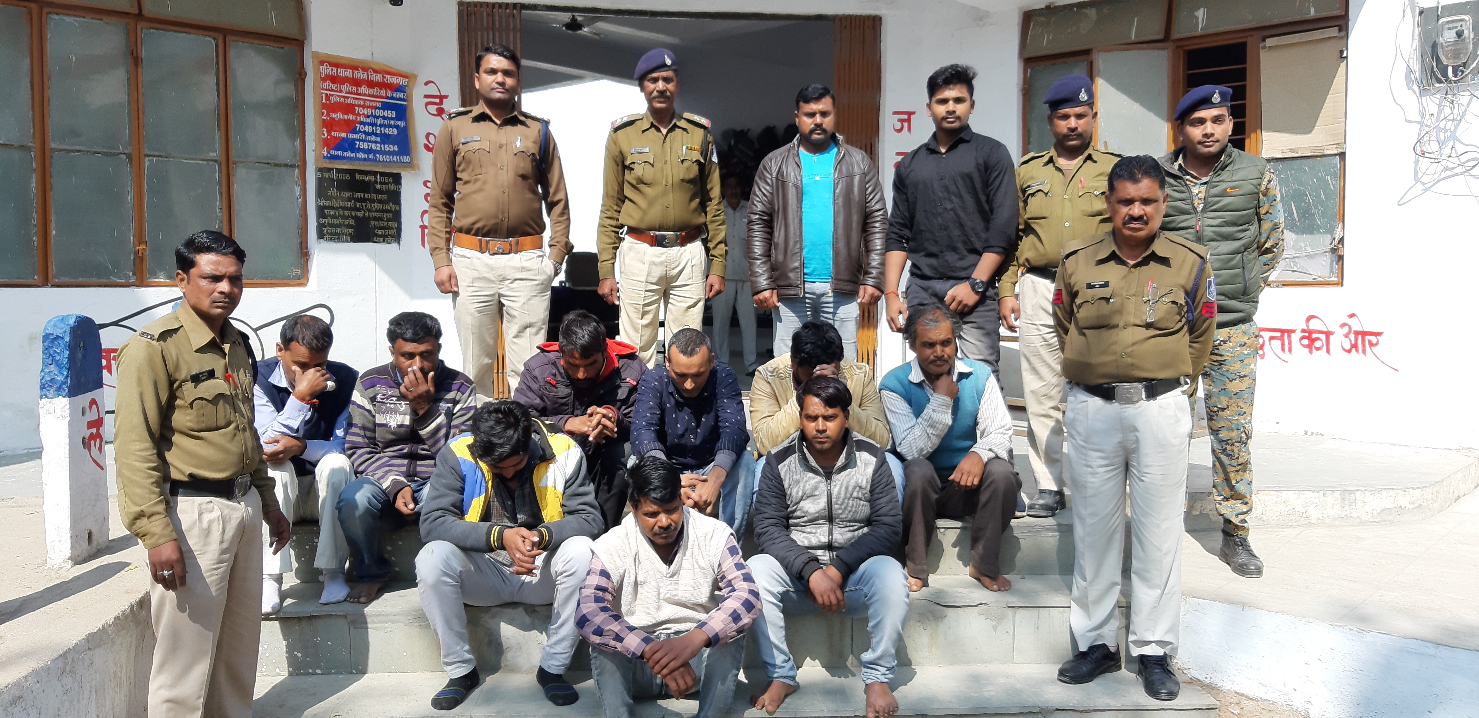 तलेन . शहर के आसपास लंबे समय से चल रहे जुंअे के अड्डे पर दबिश डालते हुए पुलिस ने नो जुआरियो को रंगे हाथों पकड़ लिया। गुरूवार देर शाम इकलेरा रोड स्थित एक खेत में चल रहे जुअं की जानकारी किसी मुखबिर ने एसपी प्रदीप शर्मा को दी थी। जिसके बाद एसपी के निर्देश पर गठित टीम ने मौके पर दबिश देते हुए वहां जुंआ खेल रहे नो जुआरियों को दबोच लिया।