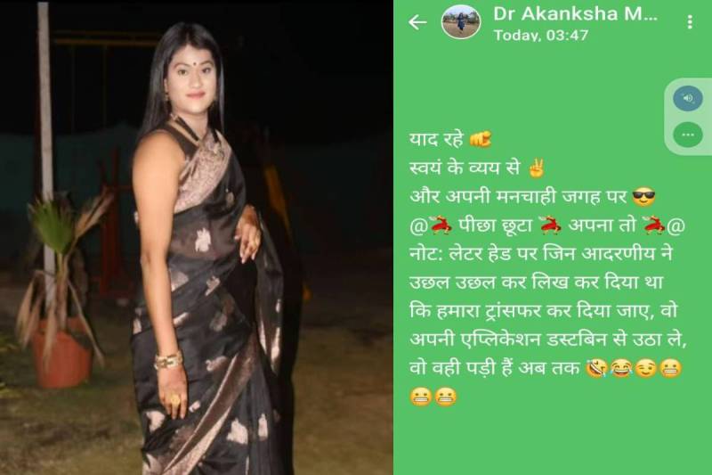 डॉ. आकांक्षा सिंह ने अपने वॉट्सएप स्टेट्स पर लिखा- याद रहे स्वयं के व्यय पर और अपनी मनचाही जगह पर… पीछा छूटा अपना तो…नोट : लेटर हेड पर जिन आदरणीय उछल-उछलकर लिख दिया था कि हमारा ट्रांसफर कर दिया जाए, वह अपनी एप्लीकेशन डस्टबिन से उठा लें, वह वहीं पड़ी है अब तक। 27 मई को ये स्टेट्स डॉ. आकांक्षा सिंह ने लगाया था। स्वास्थ्य विभाग के संयुक्त संचालक ने उन्हें तत्काल प्रभाव से निलंबित कर दिया है। मप्र सिविल सेवा नियम-1966 के नियम-3 के तहत अनुशासनात्मक कार्रवाई की गई। उनका यह आचरण शासकीय सेवकों के पदेय दायित्वों के विरोध में पाया गया है।