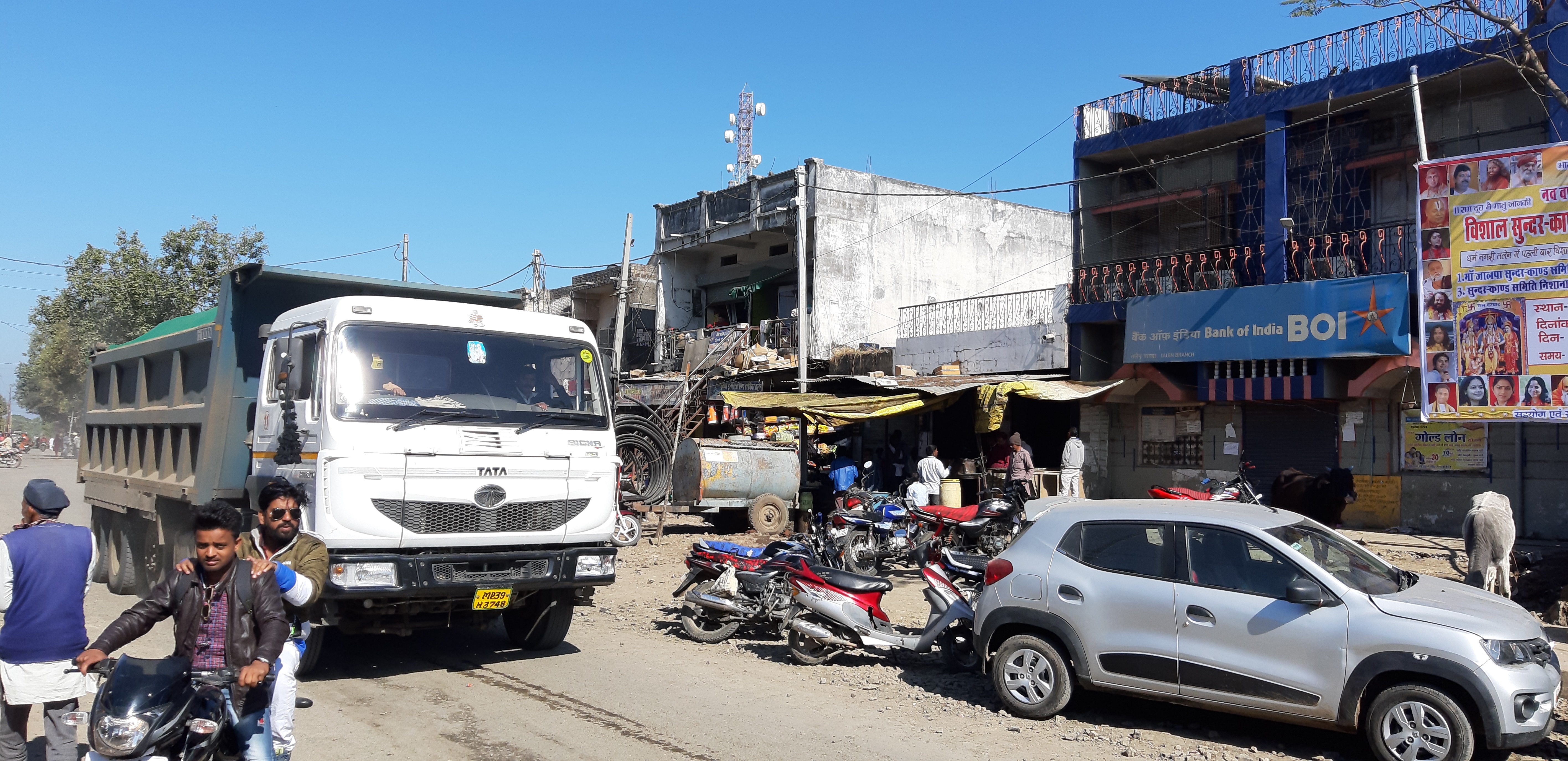 तलेन। शहर के मध्य से निकलते रेत से ओव्हरलोड भरे डंपर।