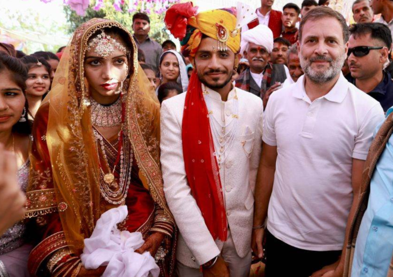 राहुल दुल्हा दुल्हन के पास जा पहुंचे और उन्हें शादी की शुभकामनाएं दीं। उन्होंने दोनों के साथ फोटो भी खिंचवाई। बाद में वे किसान संवाद के लिए रवाना हो गए।