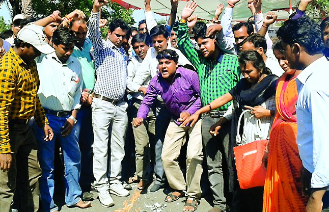 अध्यापक संघ के सदस्यों द्वारा शुक्रवार से खिलचीपुर नाके पर धरना दिया जा रहा