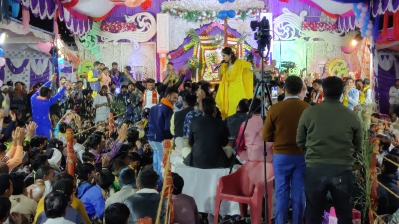 ब्यावरा.भजन संध्या के दौरान प्रस्तुति देती जयपुर से आईं मुख्य कलाकार।