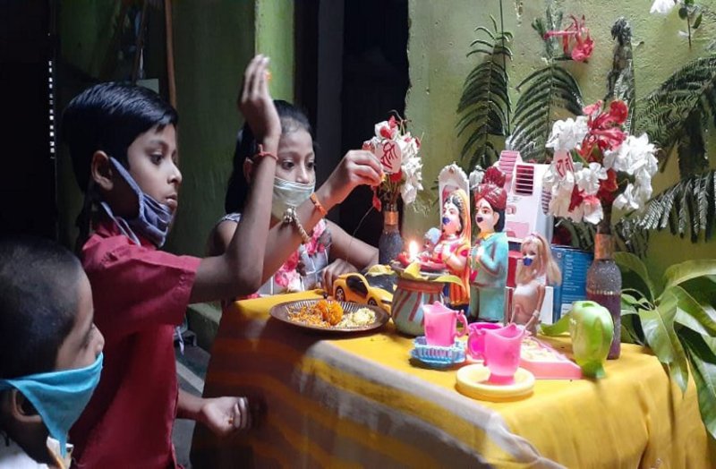 राजनांदगांव. कोरोना संक्रमण का भय अक्ती पर्व पर होने वाली गुड्डे-गुढिय़ों की शादी को नहीं रोक पाया। बच्चों का अपने गुड्डे-गुढिय़ों की शादी रचाने का उत्साह कोरोना के भय पर भारी पड़ गया। बच्चे अपने गुड्डे गुढिय़ों की शादी में सोशल डिस्टेसिंग व मास्क लगाकर लोगों को जागरुक रहने का संदेश भी दिए। इस तरह बच्चों ने बताया कि कोरोना हारेगा और भारत जीतेगा।