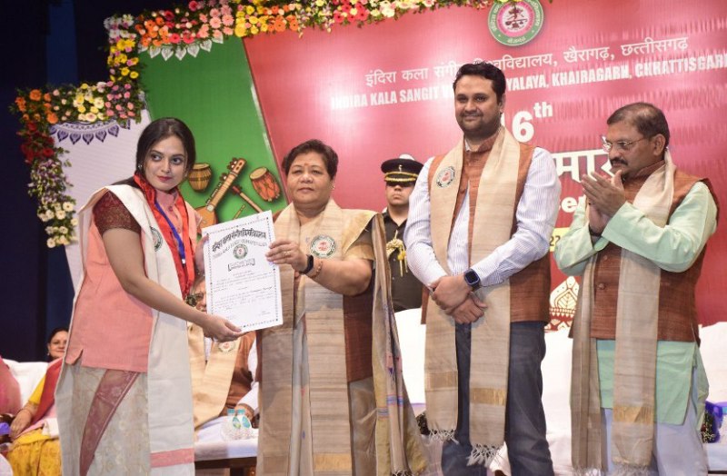 खैरागढ़. इंदिरा कला संगीत विवि के 16वें दीक्षांत समारोह में पहुंची राज्यपाल अनुसुइया उइके ने पाश्र्वगायिका कविता कृष्णमूर्ति, पदमश्री उमा शर्मा, प्रसिद्ध संगीतज्ञ पं विद्याधर व्यास, प्रों देवेन्द्र राज अंकुर, सहित लोककलाकार दिलीप षढंगी को विवि की ओर से मानद डीलिट की उपाधि से सम्मानित किया।