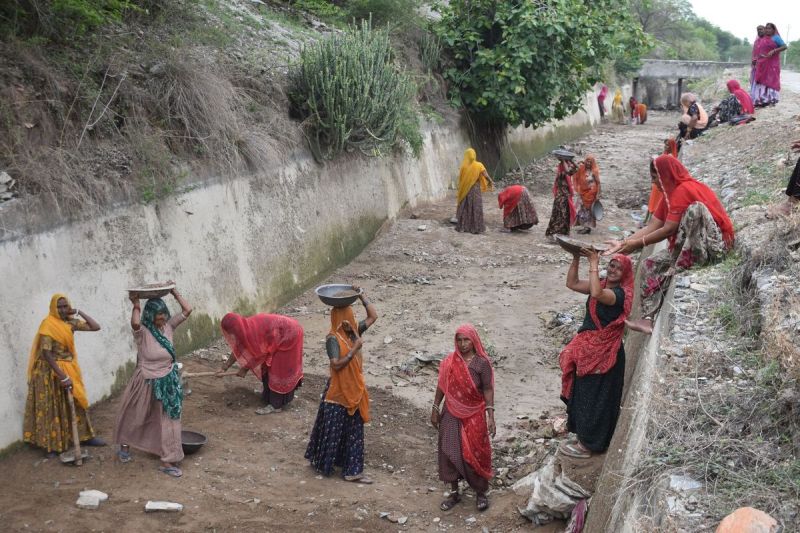 खारी फीडर की सफाई करती मनरेगा श्रमिक