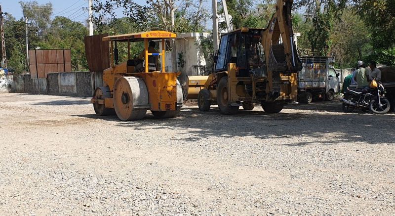 फल-सब्जी मंडी में सीसी रोड निर्माण में लगा रोलर व जेसीबी।
