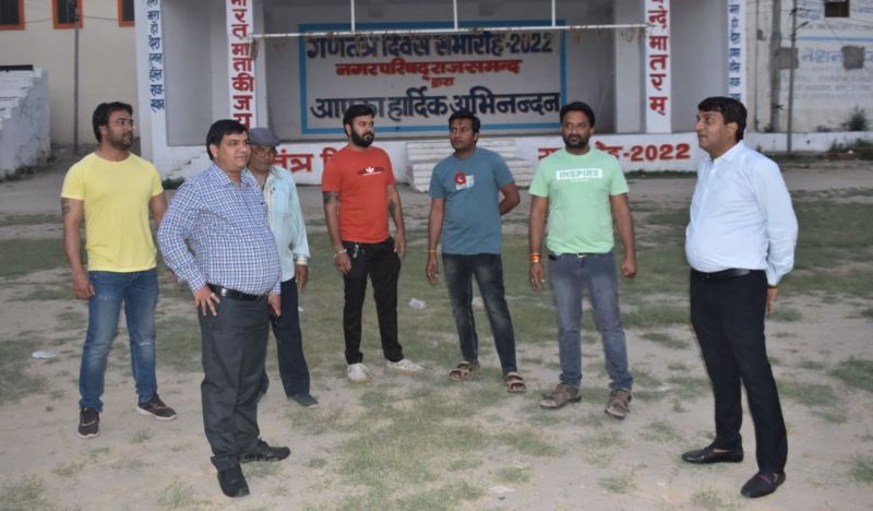 आरजे2427 राजमसंद के बाल कृष्ण स्टेडियम में गणगौर मेले की व्यवस्थाओं के संबंध में चर्चा करते सभापति अशोक टांक व अन्य