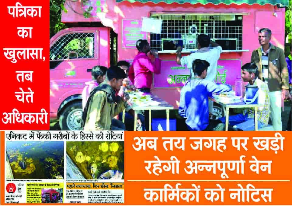 नगरपषिद की अनुमति के बिना तय जगह से अन्नपूर्णा रसोईघर योजना की वेन बदलने को लेकर ट्रस्ट के कार्मिकों को नोटिस जारी कर जवाब तलब किया है। पत्रिका में खबर प्रकाशित होने के बाद नगरपरिषद आयुक्त ब्रजेश रॉय ने योजना के सुपरवाइजर को भी तलब कर लिया। साथ ही बिना अनुमति जगह बदलने को लेक जवाब मांगा।