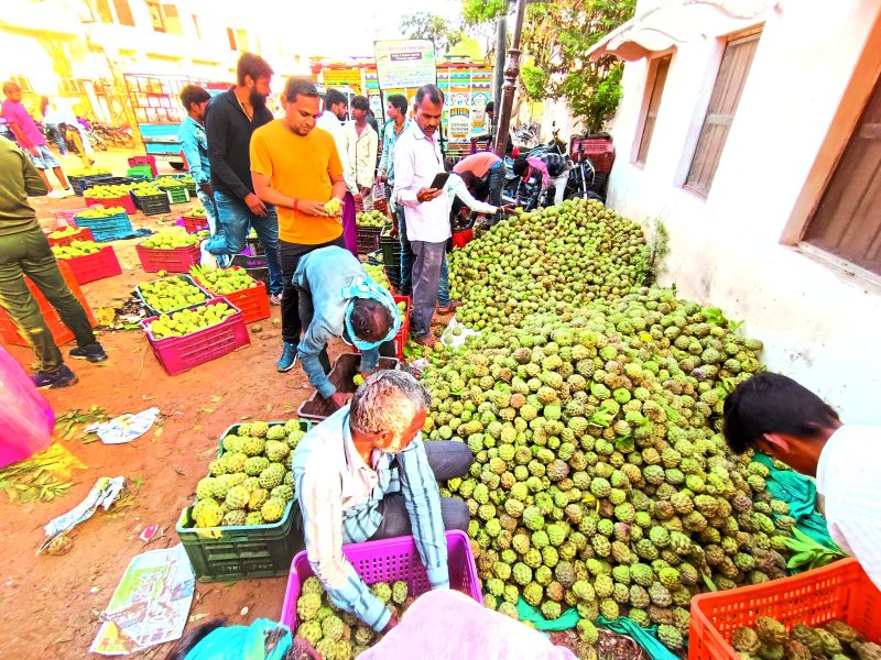 नाथद्वारा में सब्जी मंडी में सीताफल का अंबार एवं सीताफल को केरेट में रखकर पार्सल करते श्रमिक। नाथद्वारा