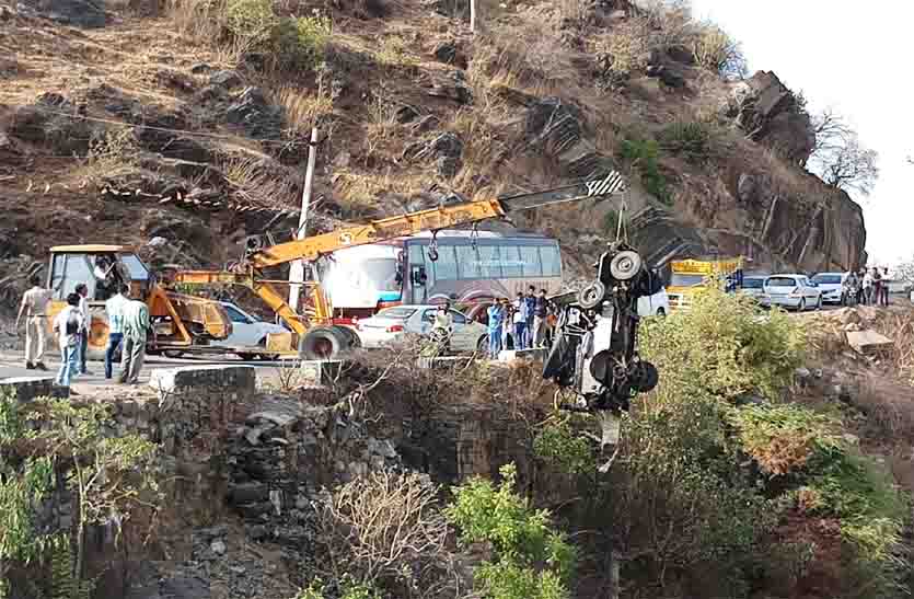 पुलिस के अनुसार केलवाड़ा से दुर्ग की तरफ जा रही जीप सामने से आ रही एक मोटरसाइकिल से टक्कर हो गई। बाइक सवार दो युवकों के गिरने से घबराए चालक ने जीप तेज रफ्तार से दौड़ाई, जिससे होटल रमाडा व रॉयल होटल के पास तीखीमाता की घाटी के मोड़ में बेकाबू होकर जीप करीब 250 फीट गहरी खाई में जा गिरी। उसी दौरान जीप में सवार एक युवक ने छलांग लगा दी जिससे वह बच गया। दुर्घटना के बाद घायल युवक ने होटल में जाकर केलवाड़ा थाना पुलिस को सूचित किया। सूचना पर मौके पर पहुंची पुलिस ने बाइक सवार दोनों घायलों के अलावा जीप में सवार चार गंभीर घायलों को भी सामुदायिक स्वास्थ्य केंद्र केलवाड़ा पहुंचाया, जहां से प्राथमिक उपचार करवाने के बाद उदयपुर रेफर कर दिया गया। घटनास्थल से 2 लोगों के शव मिले हैं, जिन्हें भी केलवाड़ा अस्पताल के मुर्दाघर में रखवाने के बाद दोपहर में पोस्टमार्टम करवाने के बाद परिजनों को सौंप दि गए। अब तक जीप चालक का कोई पता नहीं चल पाया, जिसके हादसे के बाद छलांग लगाकर फरार होने का संदेह जताया जा रहा है।