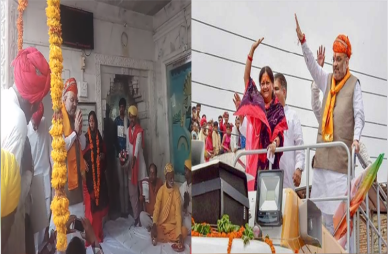 मंदिर में करीब सात मिनट रुकने के बाद राष्ट्रीय अध्यक्ष अमित शाह के आने की सूचना मिली, इस पर CM मंदिर से हेलीपैड के लिए रवाना हो गईं। यहां शाह का स्वागत कर करीब आधे घंटे बाद वह पून: मंदिर पहुंची। यहां पुजारियों ने गर्भगृह में शाह का बहुमान किया बाद में बैठक में पांच पुजारियों ने शाह और मुख्यमंत्री को पूजा अर्चना करवाई। यहां करीब 10 मिनट रुकने के बाद दोनों लोग रवाना हो गए। रथ को किया रवाना पूजा अर्चना के बाद शाह, राजे और भाजपा के प्रदेश अध्यक्ष मदन सैनी ने एक बस में बने रथ के ऊपर चढक़र झंडी दिखाई। इसके बाद तीनों नेता उसी रथ मेें बैठकर हेलीपैड पहुंचे। यहां से सभा के लिए राजकीय जेके स्टेडियम रवाना हुए।