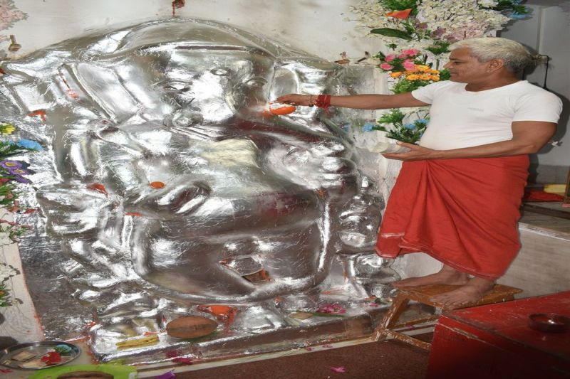 मंशापूर्ण महागणपति मंदिर में गणेश प्रतिमा का श्रृंगार करते पुजारी।