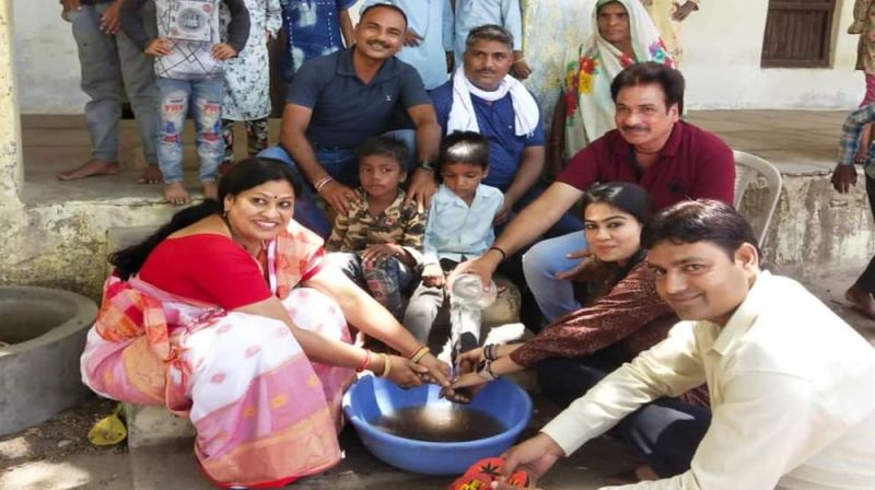 मिशन चरण पादुका के तहत बच्चों के पैर धोकर चप्पल पहनाते हुए