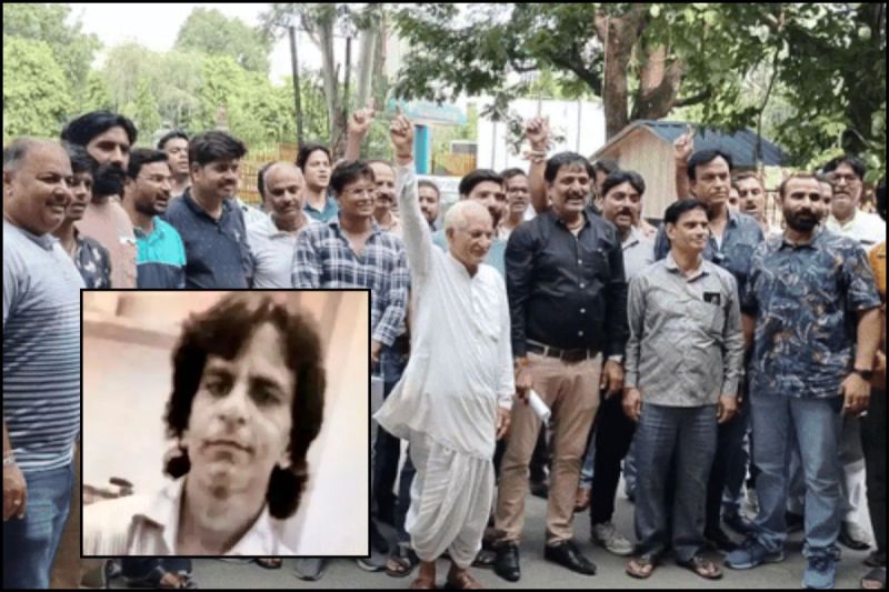 ज्वेलर की गिरफ्तारी का विरोध प्रदर्शन करते समाज के लोग और मृत ज्वेलर, फोटो - पत्रिका