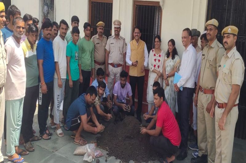 जिला कारागृह में सीड बॉल तैयार करते बंदियों को देखते जिला एवं सेशन न्यायाधीश एवं अन्य।