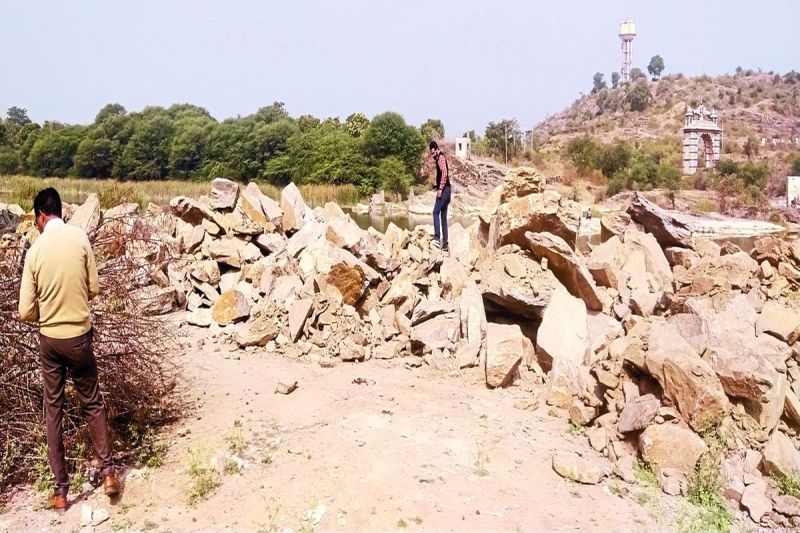 बनास नदी के पेटे में पड़े पत्थर और मलबा