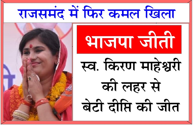 यहां पूर्व विधायक स्व किरण माहेश्वरी की बेटी दीप्ति को जनता ने विधायक बनाया। राजसमन्द सीट पर 2018 के चुनाव में दीप्ति की मां किरण माहेश्वरी 24,623 मतों से जीती थीं। दीप्ति को सहानुभूति का फायदा मिला है। बीजेपी ने पार्टी के तमाम दावेदारों को दरकिनार कर दीप्ति को टिकट दिया था।