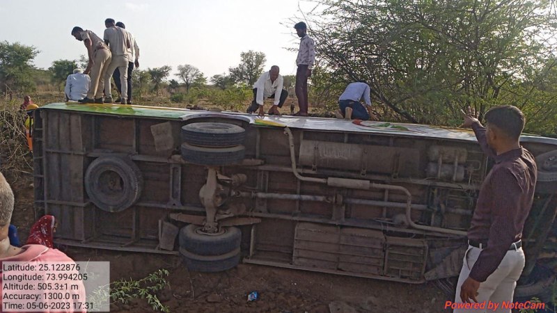 थाना क्षेत्र के कुरज से जीनगर समाज के लोगो के द्वारा एक निजी बस में सवार होकर किसी सामाजिक कार्यक्रम के लिए ढेलाणा स्थित स्थानक परिसर में जा रहे थे। इस दौरान बस कुंवारिया से साकरोदा चौराहा मार्ग पर गुजरने के दौरान बेकाबू होकर सड़क के किनारे खड्डे व झाडिय़ों में पलट गई। बस के पलटते ही बस में सवार यात्रियों में अफरातफरी मच गई। मार्ग से गुजरते राहगीरंों व बस से बाहर निकले युवओं ने बस की खिड़कियों के शीशे तोड़कर बस में सवार यात्रियों को बाहर निकाला।