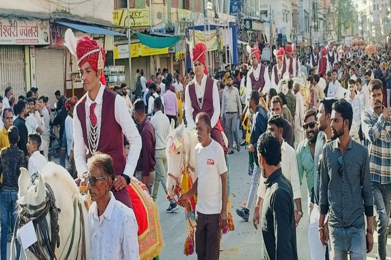 राजसमंद. कुमावत समाज रूणपछौर चौकी संस्थान एवं कुमावत समाज विकास सेवा समिति की ओर से आयोजित प्रथम श्री तुलसी विवाह के प्रथम दिन श्री ठाकुरजी की भव्य शोभायात्रा जोश और उत्साह के साथ निकाली गई। शादी से पूर्व बरात व वर-वधू की शहर में बिंदोली निकाली गई। श्रद्धा और उत्साह के साथ भक्ति संगम देखने को मिला। आज मंगलवार को अपराह्न तीन बजे सभी दुल्हने दूल्हे के साथ विदा की गई। अशोक कुमावत ने बताया कि कार्यक्रम की शुरुआत सोमवार को श्री कुमावत समाज रुणपछौर चौकी संस्थान, रावली पाटिया कांकरोली में सुबह 10 बजे वर-वधू आगमन, सेल्फी कार्यक्रम के बाद दोपहर 3 बजे श्री ठाकुरजी (सालिगरामजी) की भव्य शोभायात्रा निकाली गई। समाजजनों की ओर से ठाकुरजी श्रीचारभुजानाथ कांकरोली, श्रीचारभुजानाथ अहमदाबाद के स्वागत में शहर के मुख्य मार्ग राठासेन माता मंदिर से रावली पाटिया तक स्वागत द्वार लगाए गए। दुल्हों के लिए घोड़े, दुल्हनों के लिए बग्गी, दो बैंडबाजों, श्री ठाकुरजी के भक्तिमय भजनों व जयकारों के साथ, स्वागत में जगह-जगह पर पुष्प वर्षा कर स्वागत किया।