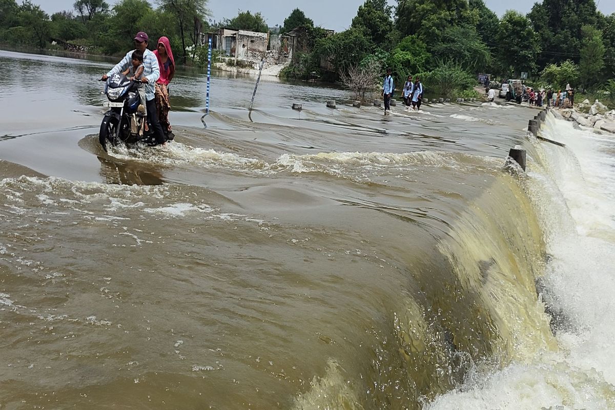 छापरखेड़ी पुलिया से बहते पानी से गुजरते वाहन एवं स्कूली बच्चे