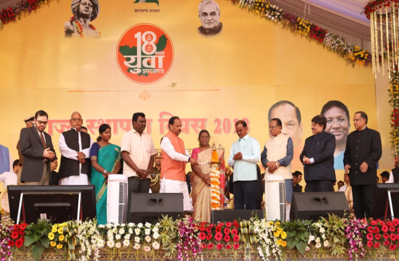 (रांची): झारखंड राज्य का 19वां स्थापना दिवस गुरूवार को मनाया गया। स्थापना दिवस समारोह का मुख्य कार्यक्रम ऐतिहासिक मोरहाबादी मैदान में आयोजित किया गया। इस दौरान मुख्यमंत्री रघुवर दास ने संपूर्ण झारखंड को खुले में शौच से मुक्त किए जाने की घोषणा की। समारोह में राज्य के तीन जिलों देवघर, हजारीबाग और लोहरदगा को पूर्ण रूप से विद्युतीकृत किए जाने की घोषणा की गई। इस मौके पर अरबों रुपए की योजनाओं का शिलान्यास और उदघाटन के साथ ही परिसंपत्तियों का वितरण भी किया गया। समारोह में करीब 2100 लोगों को नियुक्ति पत्र भी दिया गया।