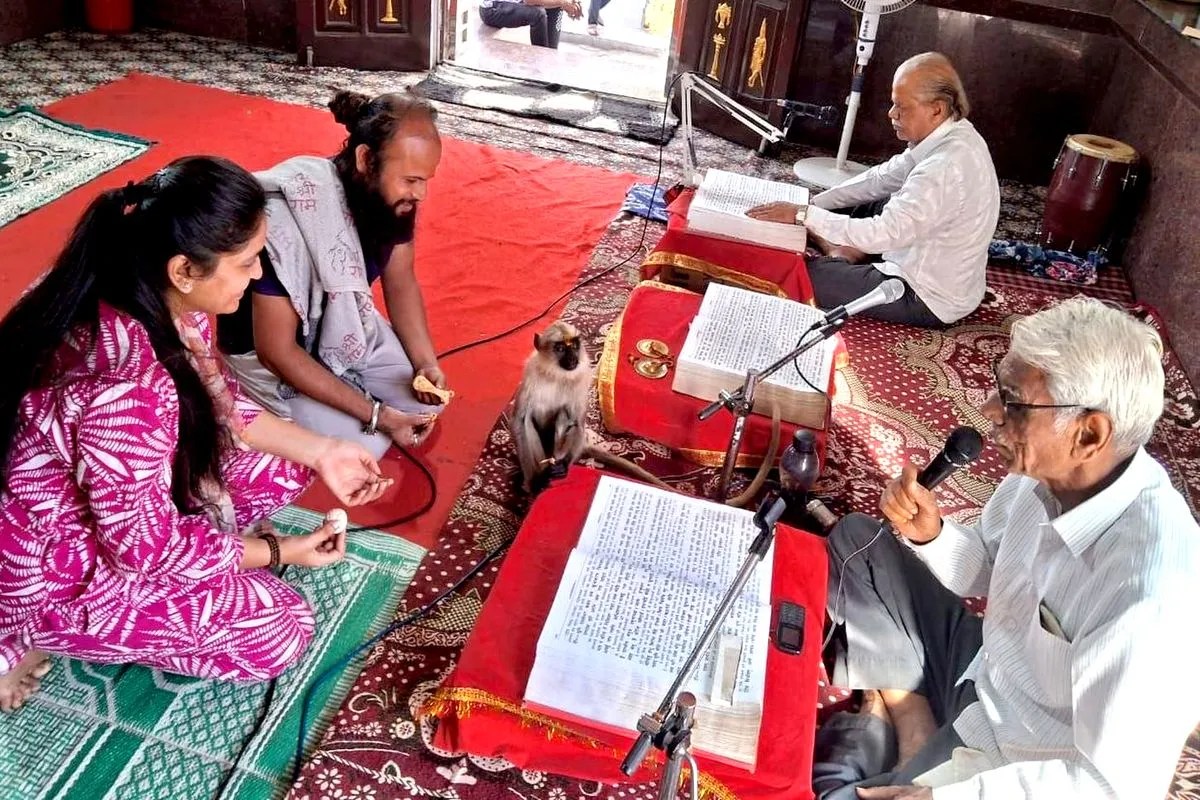 हुआ ऐसा कि रविवार शाम धर्मालु रामचरित मानस का पाठ कर रहे थे, अचानक एक वानर मंदिर में आ गया। बेखोफ वह कुछ समय मंदिर की सीडिय़ों पर बैठा रहा, फिर गर्भगृह में प्रवेश किया। देखते ही देखते वह मानस पाठ कर रहे धर्मालुओं के मध्य जाकर बैठ गया और पाठ को जैसे श्रवण कर रहा हो, मानस पाठ के दौरान वह कभी धर्मालुओं को गोद में तो कभी मानस पुस्तक पर बैठकर भक्तिरस का आनंद ले रहा हो।