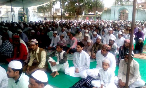 शनिवार सुबह से पुरानी ईदगाह पर समाजजन एकत्रित होने लगे थे, वही काजीपुरा स्थित काजी हाउस से बग्घी में सवार होकर समाजजनों के साथ शहरकाजी ईदगाह के लिए रवाना हुए। प्रमुख मार्गो से होता हुआ जुलूस लक्कड़पीठा पहुंचा, यहां नमाज अदा करवाने के साथ ही शहर और मुल्क में अमन चेन की दुआ करते हुए सभी की खुशहाली की कामना की। ईदगाह परिसर में पुलिस बल सहित कलेक्टर तन्वी सुंद्रियाल, एसपी अमितसिंह, एडीएम डॉ. कैलाश बुदेंला, एसडीएम नेहा भारतीय, एएसपी गोपाल खंडेल, सीएसपी विवेकसिंह चौहान, निगम आयुक्त एसके सिंह सहित सामाजिक, राजनैतिक जनप्रतिनिधि में विनोद मिश्रा मामा, ईक्का बेलूत, ने भी पहुंचकर समाजजनों को ईद की मुबारक बात दी। ईदगाह की दीवार पर नमाज के पूर्व कुछ शरारती तत्वों ने शब्द लिख दिए थे, जिसकी शिकायत काजी आसिफ अली द्वारा नमाज के बाद एसपी से ईद मुबारक मिलन के दौरान की। पुलिसकर्मियों ने पहुंचकर लिखे शब्दों मिटवाकर मामला शांत किया गया।