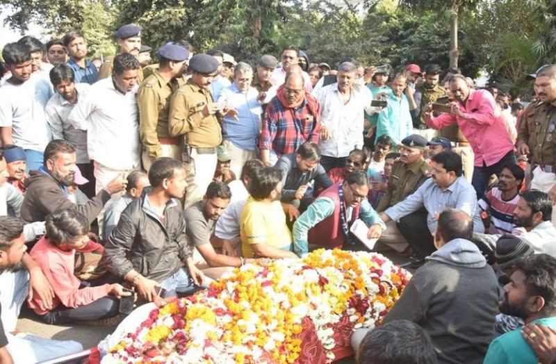 बाद में मृतिका कविता का शव लेकर पति दीपक व अन्य नगर निगम के शव वाहन से पहुंचे। इसके बाद करीब दो घंटे तक शव रखकर प्रदर्शन चला। इस दौरान मुख्य रोड पर शव रखा व रोड को जाम कर दिया। कर्मचारी नेताओं ने इस दौरान संबोधन दिया। नेताओं का कहना था 11 लाख रुपए का व्यय कर मशीन से काम कराया जा रहा है, इसके बजाए 100 कर्मचारी नियुक्त किए जाए तो बेहतर सफाई होगी। धरने होगा, इसकी सूचना मिलने पर नगर निगम से महापौर प्रहलाद पटेल व आयुक्त गहरवाल चले गए।